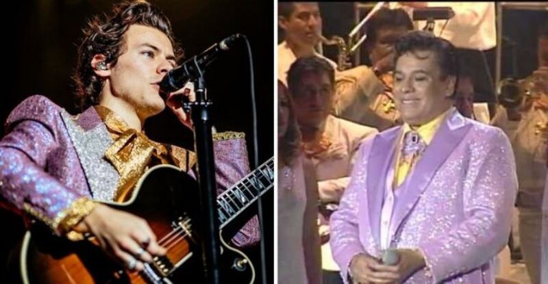 Aunque no sabemos si exista una conexión entre el británico, de 28 años de edad, y Juan Gabriel, fallecido en 2016 a la edad de 66 años, lo cierto es que los fans han encontrado que los trajes de Styles son casi idénticos a los que utilizó el “Divo de Juárez”. Aquí te dejamos algunas de las comparaciones que han hecho usuarios en redes sociales.