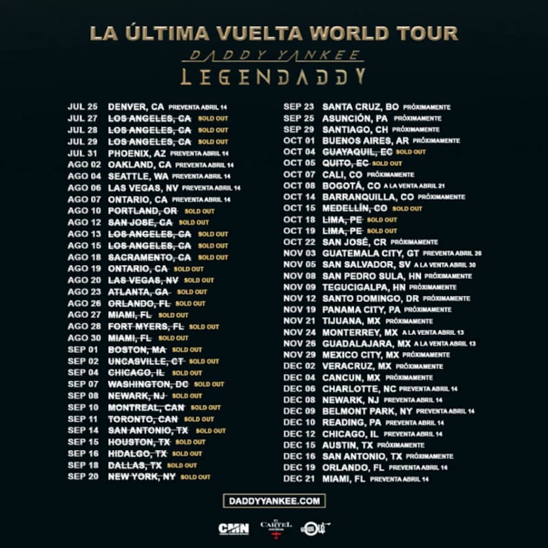 Luego de que Daddy Yankee anunciara su retiro de la música, el pasado mes de marzo, el puertorriqueño señaló que haría una última gira mundial titulada La última vuelta World Tour, donde interpretará para sus miles de fanáticos sus inolvidables temas musicales.
