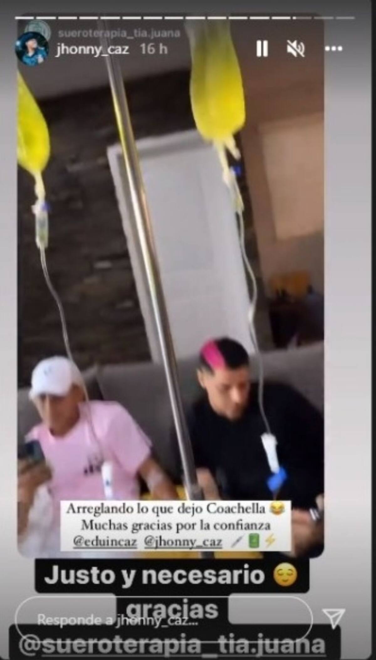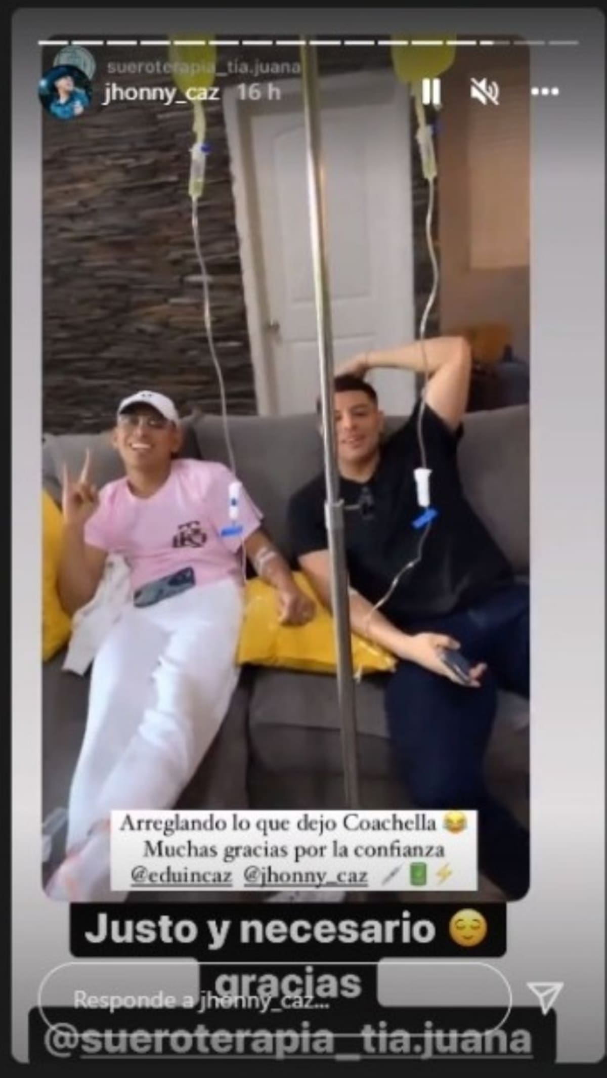 “Arreglando lo que dejó Coachella. Muchas gracias por la confianza”, escribió la cuenta que les estaba suministrando las vitaminas, la cual mostró al líder de Grupo Firme y su hermano recibiendo suero, en su feed de redes explicaron que era suero vitaminado. “Como hemos andado en friega, nada que un buen suero no arregle”, mencionó Eduin.