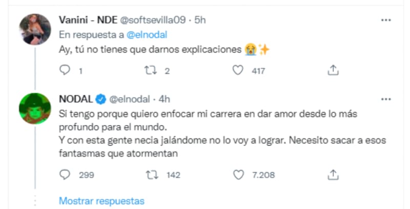 Sin embargo, Nodal no se quedó callado y respondió con otro tweet: “Sí lo hice, le llamé varias veces. Le escribí y no cambió nada. No se trata de dinero se trata de que siguen y siguen tratando de afectar. Ni siquiera el éxito les sirve para dejarme en paz. Solo faltaba ese empujón que me dieron para que por fin decidiera qué hacer”.