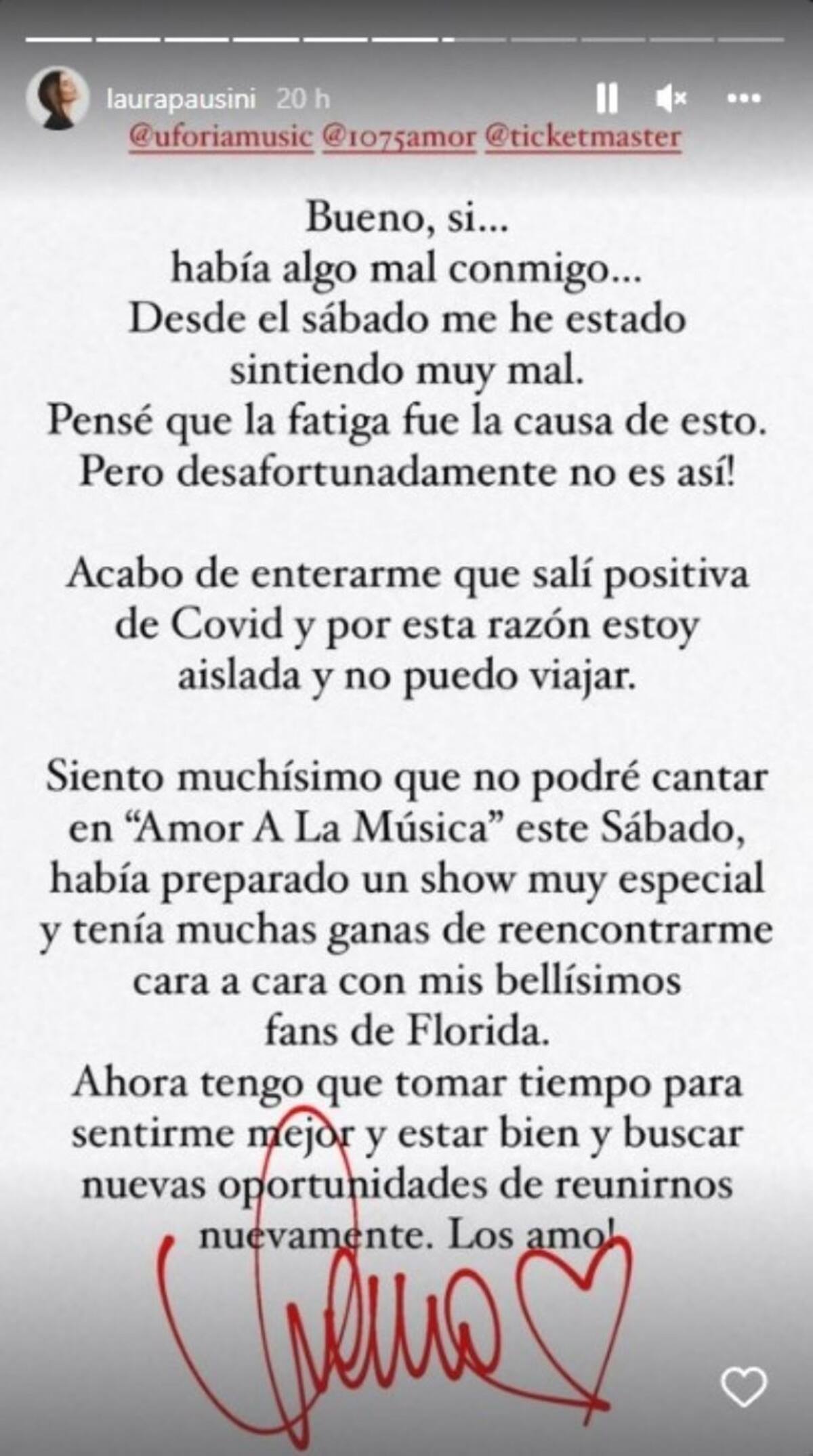 “Siento muchísimo que no podré cantar en Amor a la Música este sábado, había preparado un show muy especial y tenía muchas ganas de reencontrarme cara a cara con mis bellísimos fans de Florida. Ahora tengo que tomar tiempo para sentirme mejor y estar bien y buscar nuevas oportunidades de reunirnos nuevamente, los amo!”, afirma el documento.