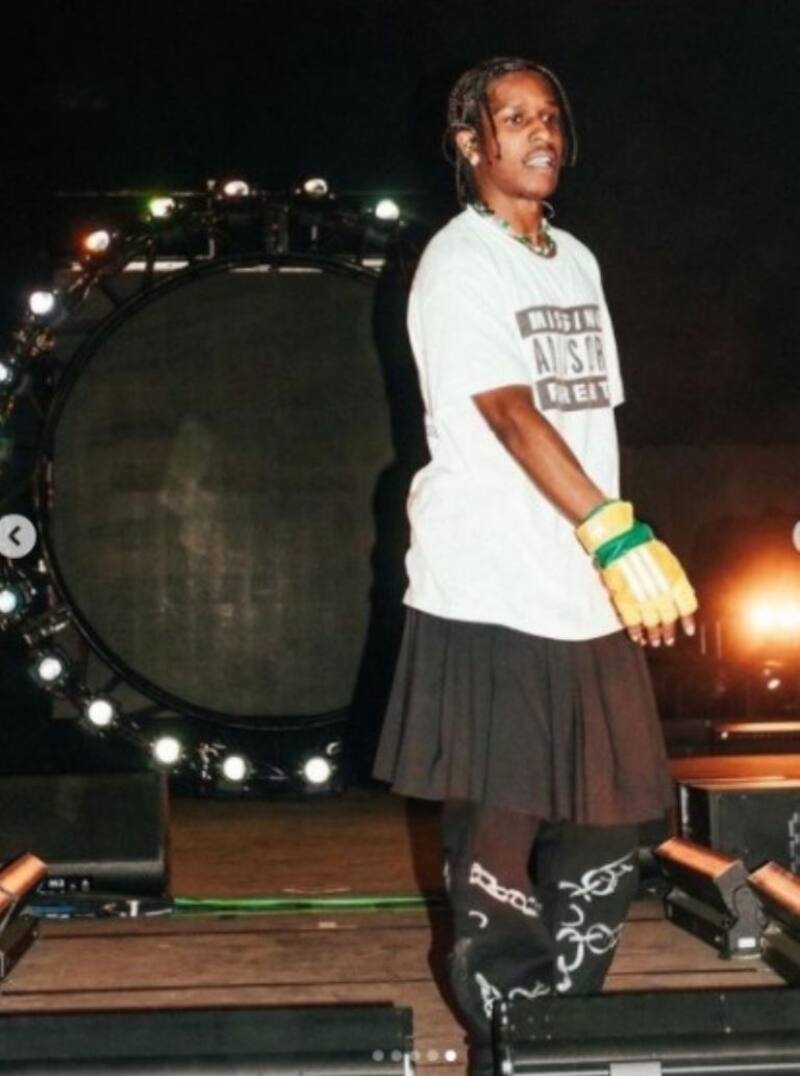 A$AP portó un look llamativo, encima del pants negro que traía se puso una falda negra tableada, una playera blanca, también optó por unos guantes amarillo tipo box. En varias ocasiones las cámaras se dirigieron a él pues la madre de su hijo seguía al pie de la letra sus canciones