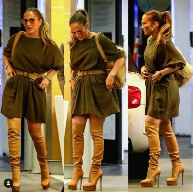 Eso sí, la “Diva del Bronx” lució un vestido color verde olivo con un cinturón casi del mismo tono que combinó con una botas camel a la altura de las rodillas y para complementar, recogió su cabello en una cola de caballo, usó gafas de sol y accesorios dorados. Sin duda los internautas han sentenciado que JLo luce mucho más radiante que nunca.