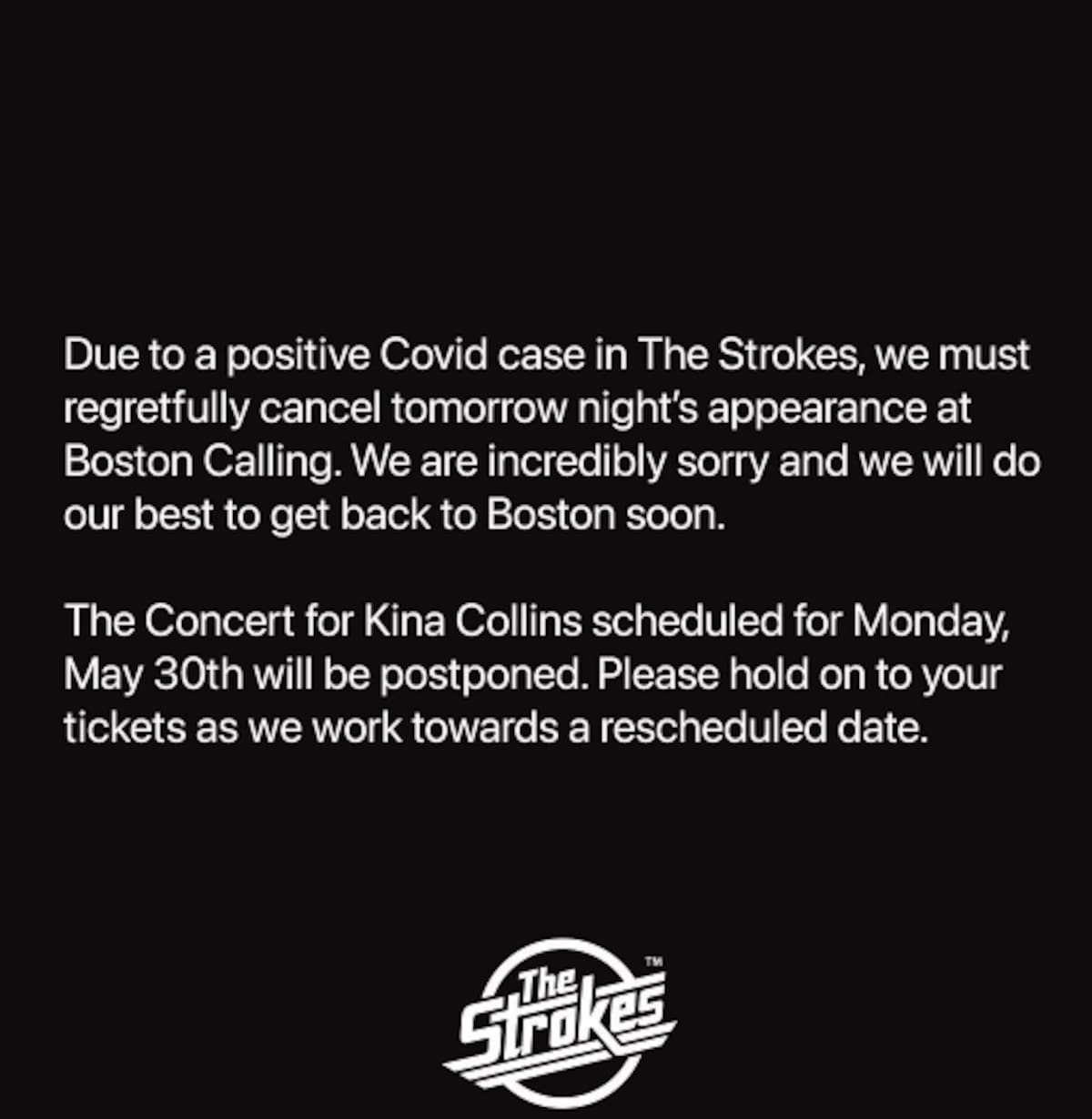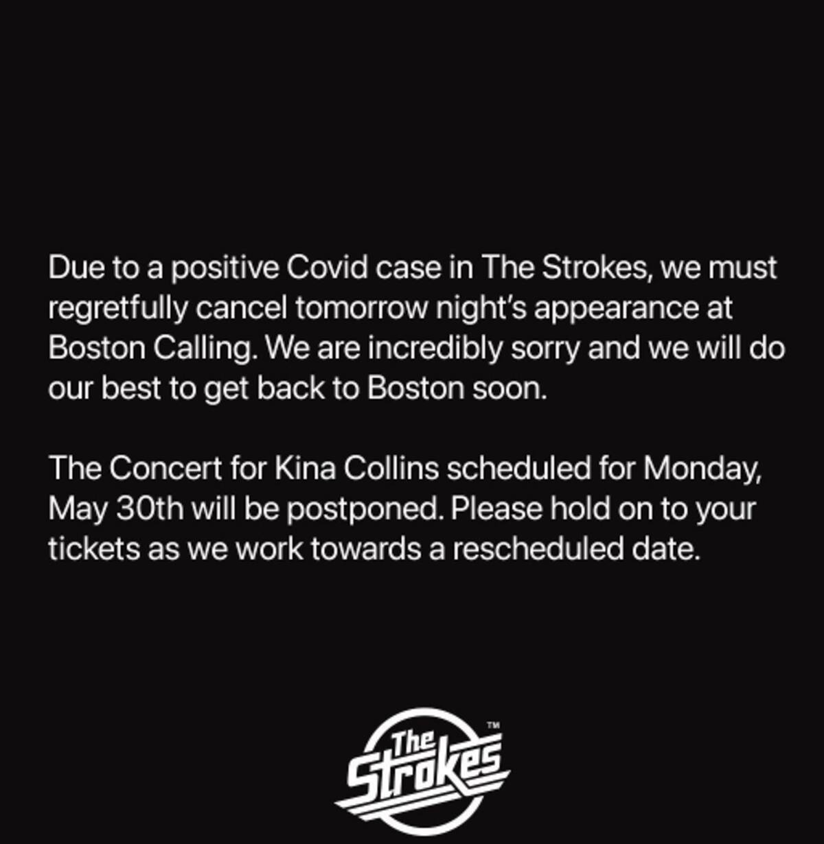 "Debido a un caso positivo de Covid en The Strokes, lamentablemente debemos cancelar la aparición de mañana por la noche en Boston Calling. Lo sentimos mucho y haremos todo lo posible para volver pronto a Boston", se leía en un comunicado que postearon en sus redes sociales.