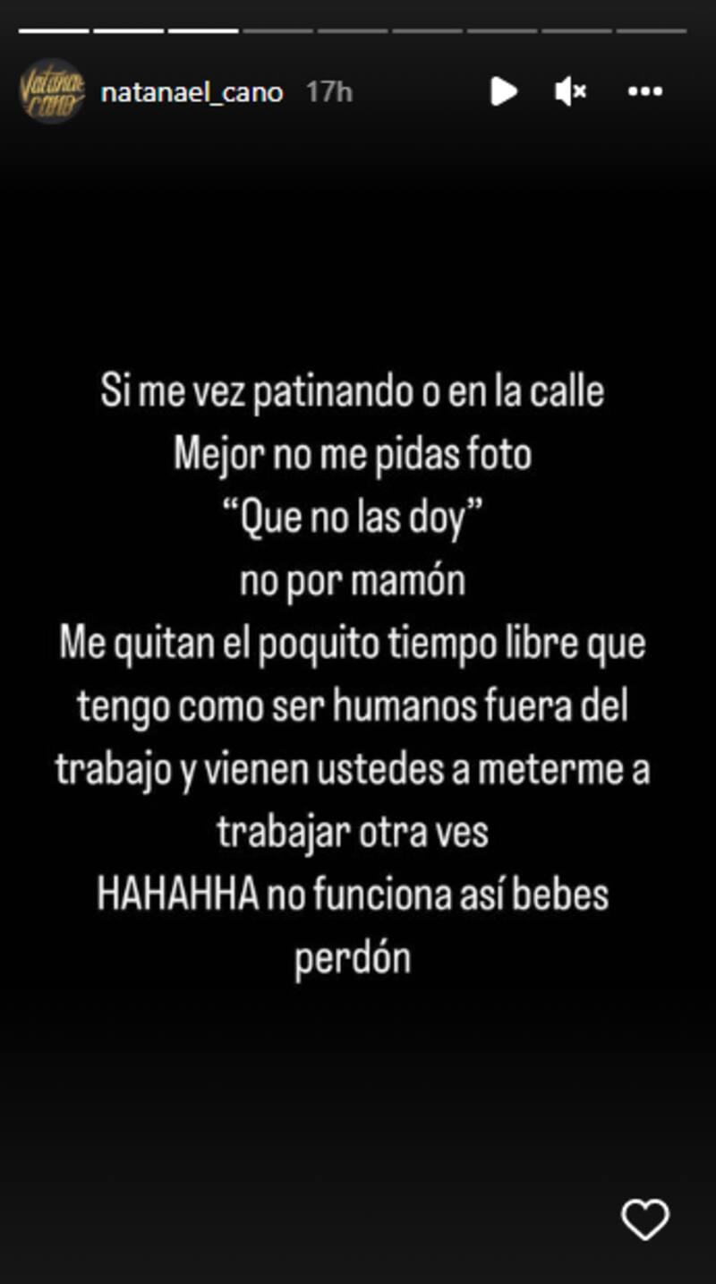 "Si me ves patinando o en la calle, mejor no me pidas foto que no las doy, no por mamón. Me quitan el poquito tiempo libre que tengo como ser humano fuera del trabajo y vienen ustedes a meterme a trabajar otra vez. Hahahaha no funciona así, bebés, perdón", escribió en sus historias de Instagram.