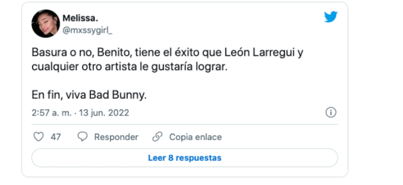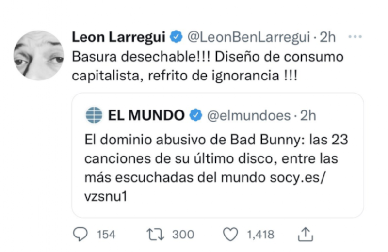 Larregui compartió un artículo donde el periódico español El Mundo en donde se decía que todas las canciones de Bad Bunny estaban en listas de popularidad. “El dominio absoluto de Bad Bunny: las 23 canciones de su disco, entre las más escuchadas del mundo”.
