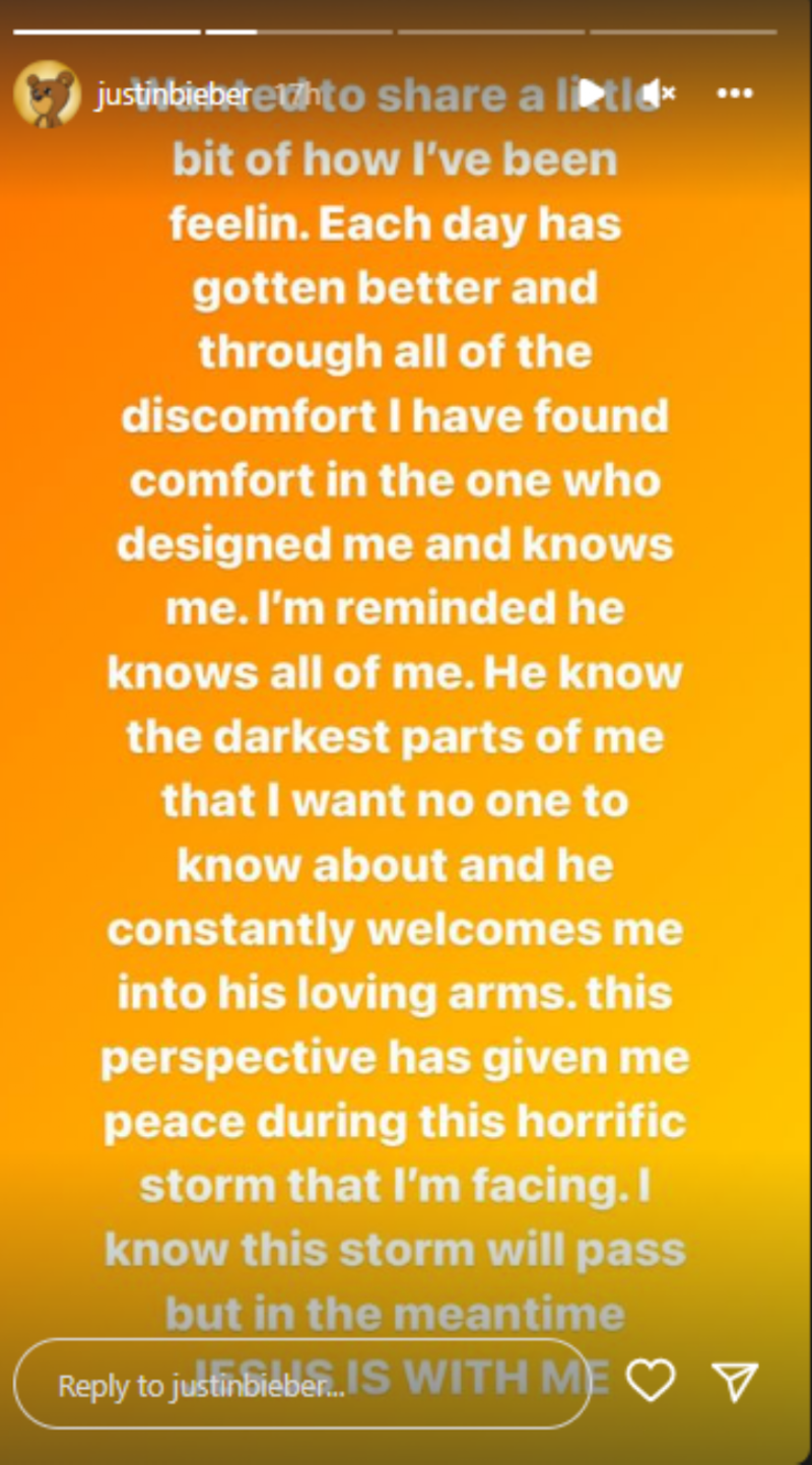 Es por ello que Justin decidió recurrir nuevamente a sus redes sociales para compartir con su público cómo va evolucionando y, sobre todo, quién le ayuda a tener fuerzas en estos momentos difíciles por los que atraviesa.