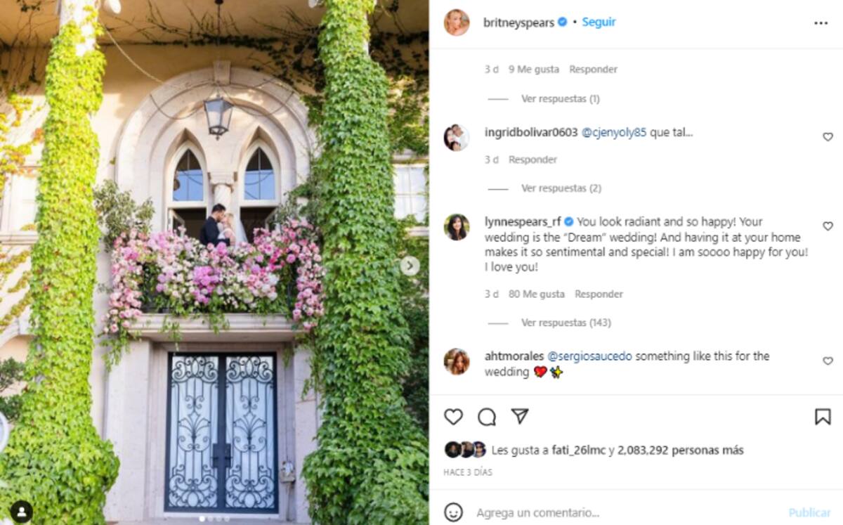 Pese al distanciamiento que existe entre la familia Spears, la madre de la intérprete de Toxic, Lynne Spears, sigue muy atenta a todo lo que involucra a su hija, por lo que no dudó en reaccionar y comentar una de las publicaciones que realizó la cantante en su cuenta de Instagram, donde se ha encargado de presumir algunos de los momentos de su boda.
