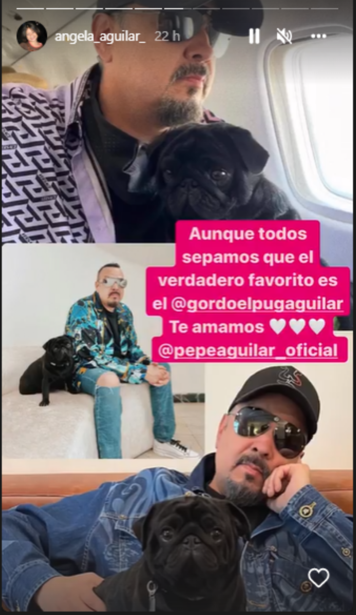 Se trata de un pug negro, la adoración de Aguilar, y así lo dejó en evidencia Ángela al subir un collage de su papá al lado del peludo amigo, en casi todas ellas cargándolo. Con lo cual además muestra que El Gordo es el preferido del cantante de regional.