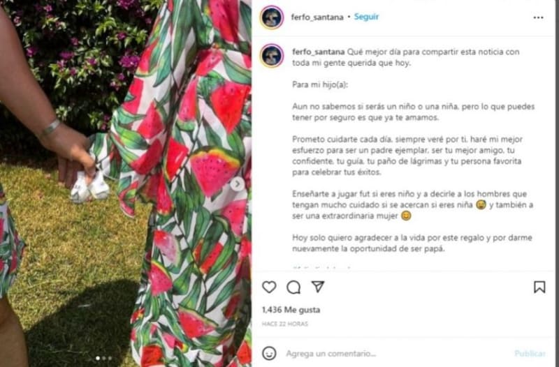 Fernando le hizo una promesa. “Prometo cuidarte cada día, siempre veré por ti, haré mi mejor esfuerzo para ser un padre ejemplar, ser tu mejor amigo, tu confidente, tu guía, tu paño de lágrimas y tu persona favorita para celebrar tus éxitos”, mencionó. También agregó que le gustaría hacer dependiendo si llega a su vida un niño o una niña, ya que aún desconocen qué será.