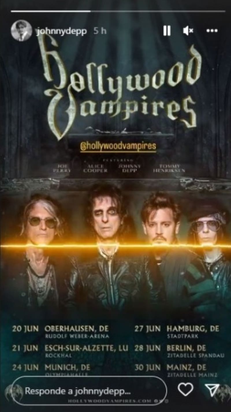 En la foto que subió se puede ver inmediatamente un póster de la agrupación The Hollywood Vampires anunciando su regreso a los escenarios y por supuesto contarán con la presencia de Johnny, quien estará de gira por Europa en 2023 al lado de Alice Cooper, Tommy Henriksen y Joe Perry.