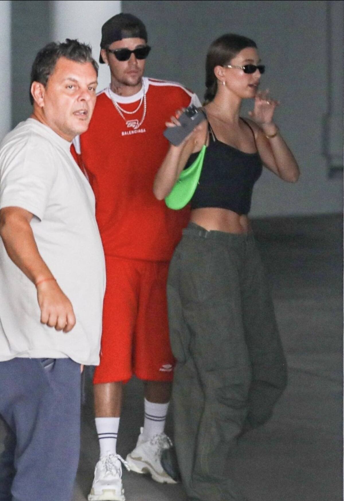 En otra instantánea, Hailey parece estar hablando con alguien más mientras Justin espera detrás de ella. El cantante luce un short deportivos largos en color rojo y una playera oversize a juego, ambos usan lentes oscuros.