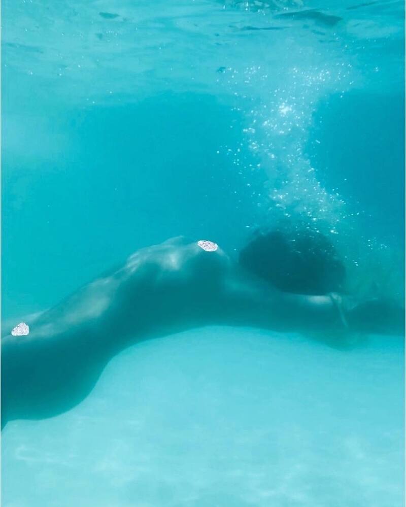 Sin dar mayores detalles de dónde se encuentra, la "Princesa del Pop" subió dos fotografías en las cuales se le ve en el mar pero nadando sin nada de ropa, eso sí, cuidando mucho de que no fueran expuestas sus partes íntimas, las cuales tapó con unas marcas.