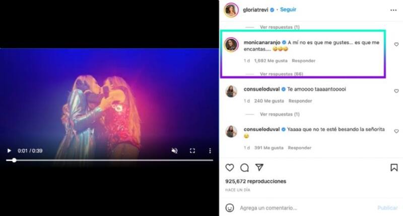 “Ustedes lo pidieron… esta canción, este encuentro, este momento, este beso, ustedes piden puras cosas bellas GUADALAJARA… Gracias @monicanaranjo #grande #valientes”, escribió Gloria junto video del momento exacto del beso y Naranjo rápidamente contestó a la publicación: “A mí no es que me gustes... es que me encantas...”, dijo la cantante de temas como Solo se vive una vez y Sobreviviré.