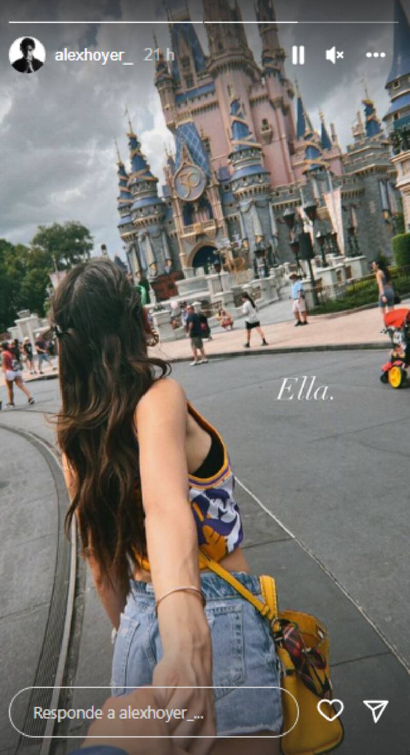 "Happiest me", se lee en la última publicación realizada por la intérprete de Mala Fama en su cuenta de Instagram, donde aparece utilizando una playera del equipo de básquebol Lakers, acompañada de unos jeans cortos y gafas, mientras que su novio le toma su mano y en el fondo el famoso castillo de Disney.