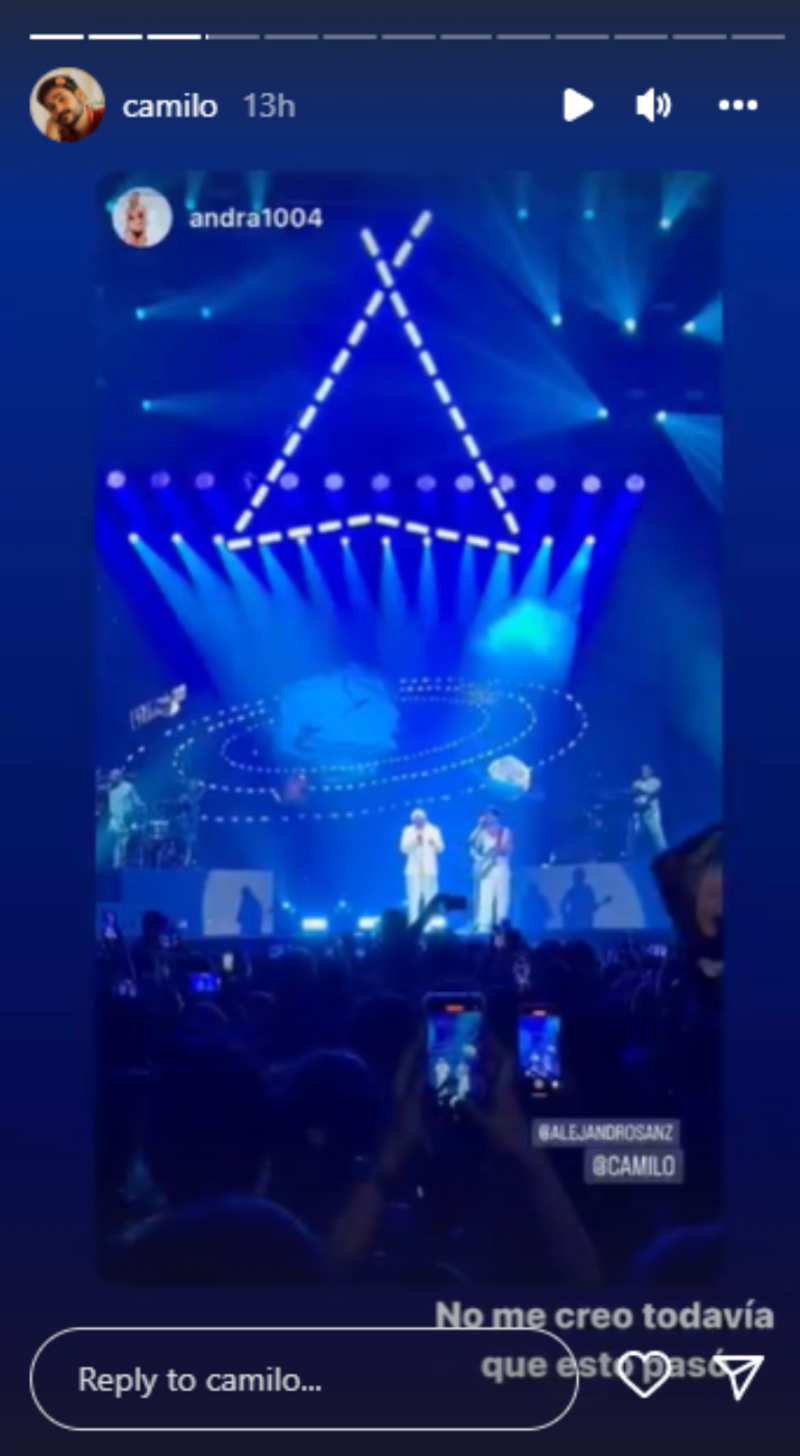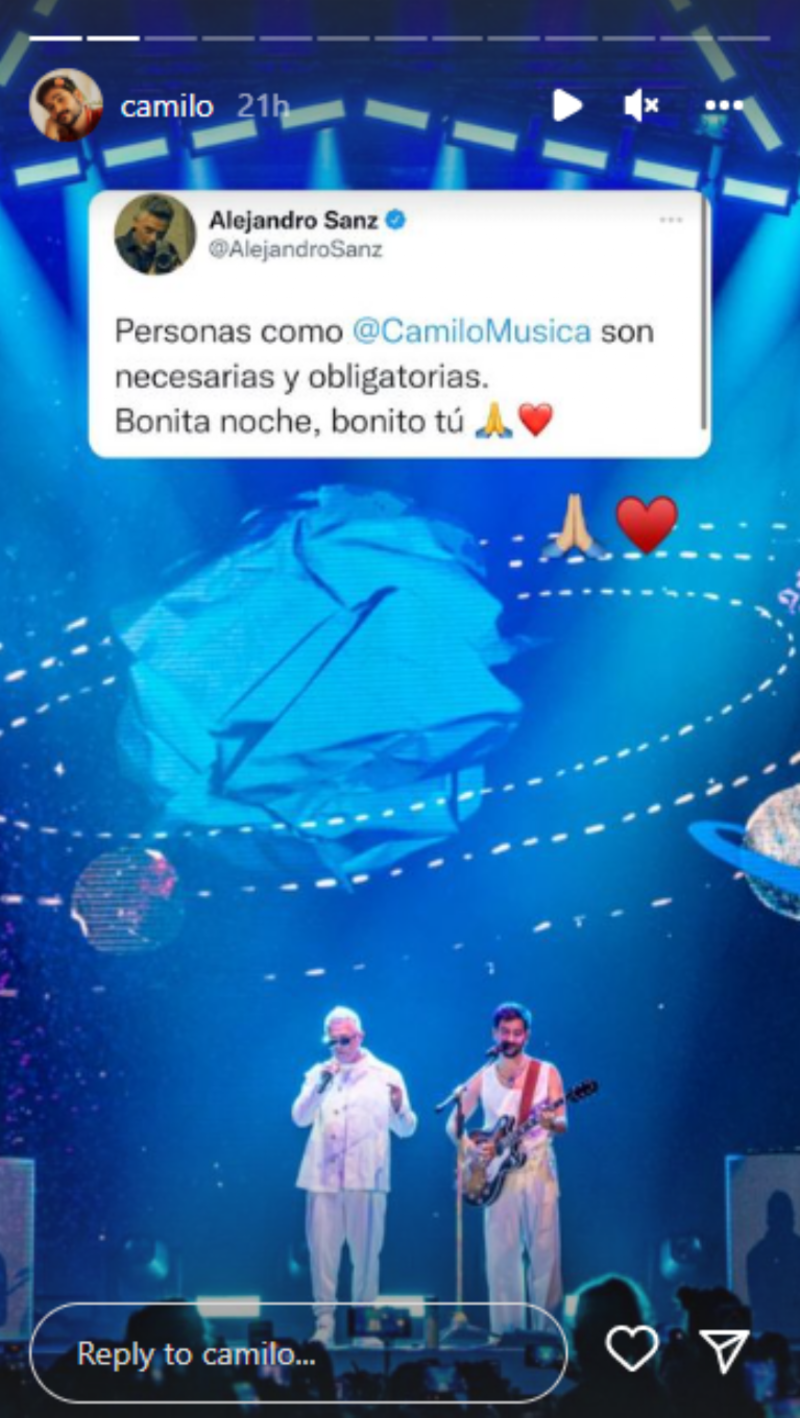 Desde niño, Camilo ha sido un fiel admirador de Alejandro Sanz, así lo confesó hace unas semanas, cuando estrenó su sencillo Nasa, en colaboración con el madrileño, es por ello que en esta ocasión no pudo evitar compartir con sus seguidores lo emocionado que se sintió de estar en el escenario con su gran ídolo y, ahora, también amigo.