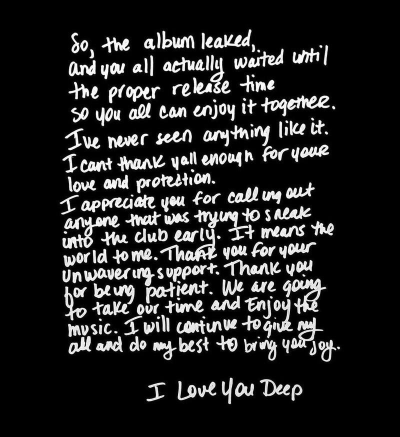"Entonces, el álbum se filtró, y todos esperaron hasta el momento adecuado del lanzamiento para que todos puedan disfrutarlo juntos. Nunca he visto algo así. No puedo agradecerles lo suficiente por su amor y protección", aseveró la artista.