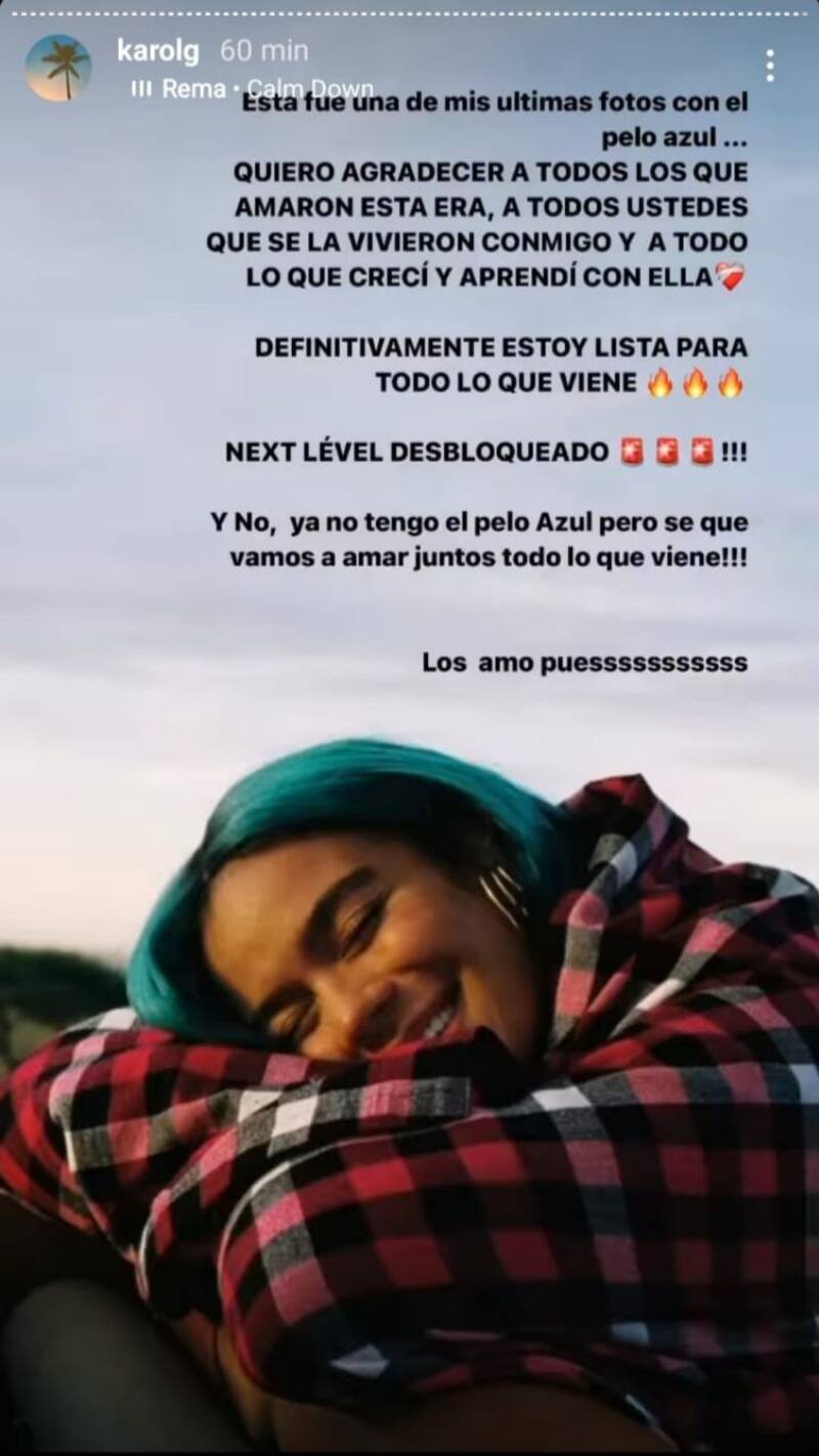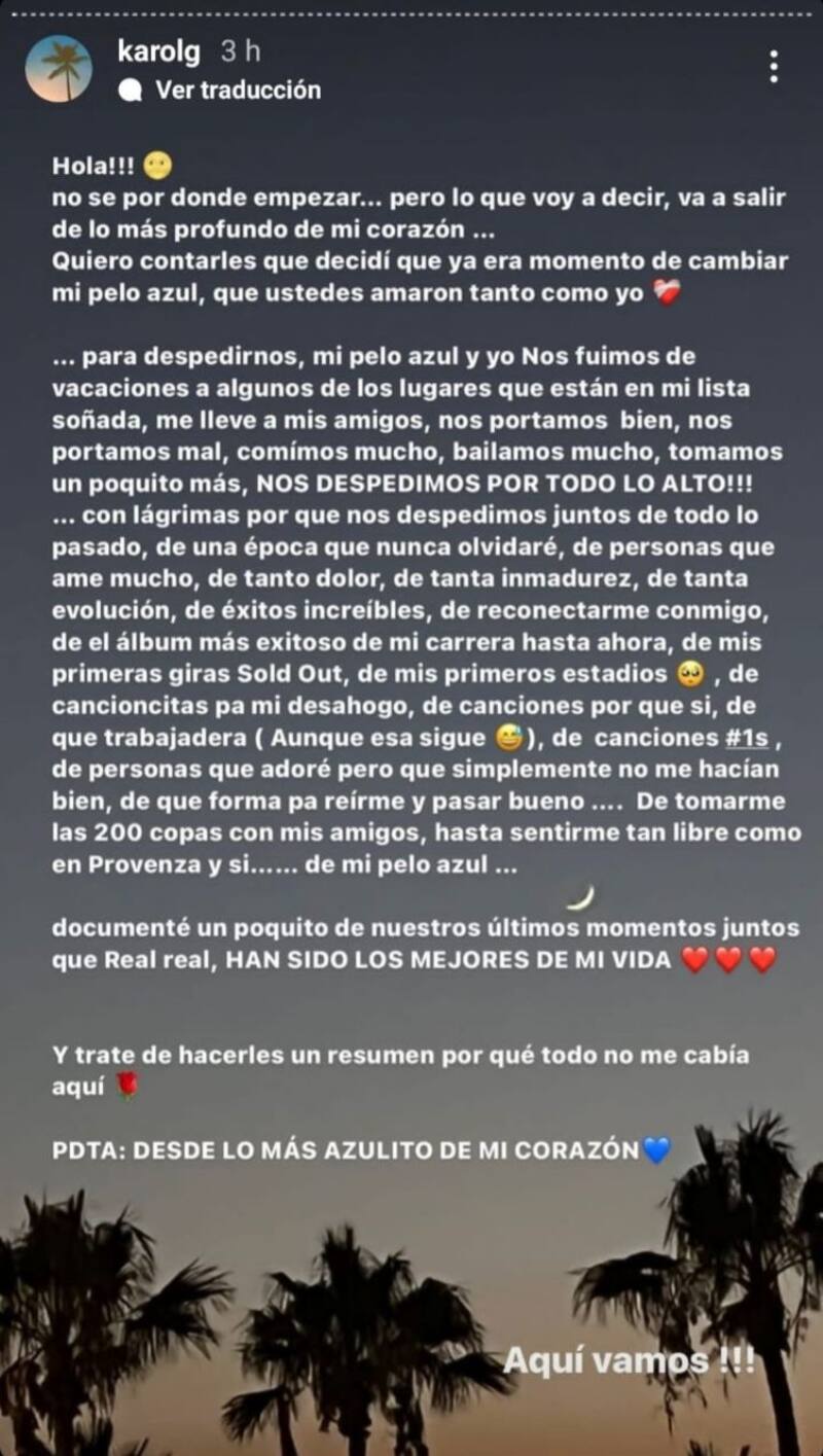 “¡Hola! No sé por dónde empezar… Pero lo que voy a decir va a salir de lo más profundo de mi corazón... Quiero contarles que decidí que ya era momento de cambiar mi pelo azul, que ustedes amaron tanto como yo. Para despedirnos, mi pelo azul y yo nos fuimos de vacaciones a algunos de los lugares que están en mi lista soñada”, comenzó expresando Karol en sus historias de Instagram.