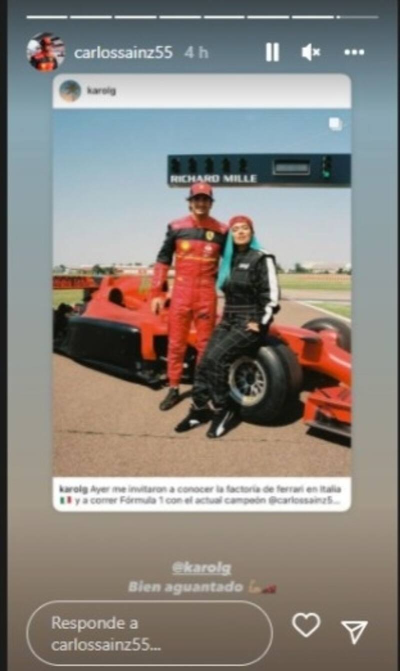 Carlos Sainz, piloto de la escudería Ferrari, utilizó sus redes sociales para enviarle un mensaje a Karlos G después de que ambos subieran a un auto de Fórmula 1 en el que recorrieron la pista a gran velocidad. "Bien aguantado", escribió en una historia de Instagram en la que compartió el posteo que subió la cantante.