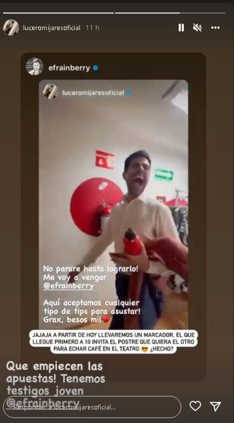 "No pararé hasta lograrlo! Me voy a vengar @efrainberry. Aquí aceptamos cualquier tipo de tips para asustar. Grax, besos mil", fue el mensaje con el cual acompañó su clip, a lo que Berry contestó: "A partir de hoy llevaremos un marcador. El que llegue primero a 10 invita el postre que quiera el otro para echar el café en el teatro. ¿Hecho?".