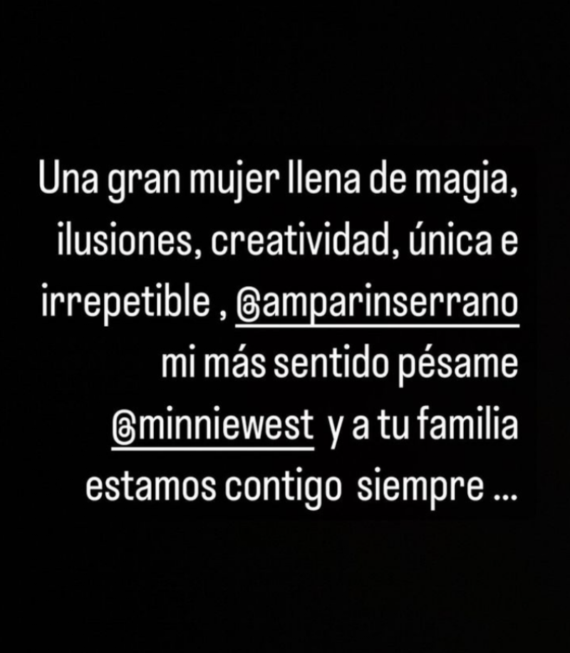 También escribió unas palabras para expresar sus condolencias: “Una gran mujer llena de magia, ilusiones, creatividad, única e irrepetible, Amparín Serrano. Mi más sentido pésame Minnie West y a tu familia, estamos contigo siempre”.