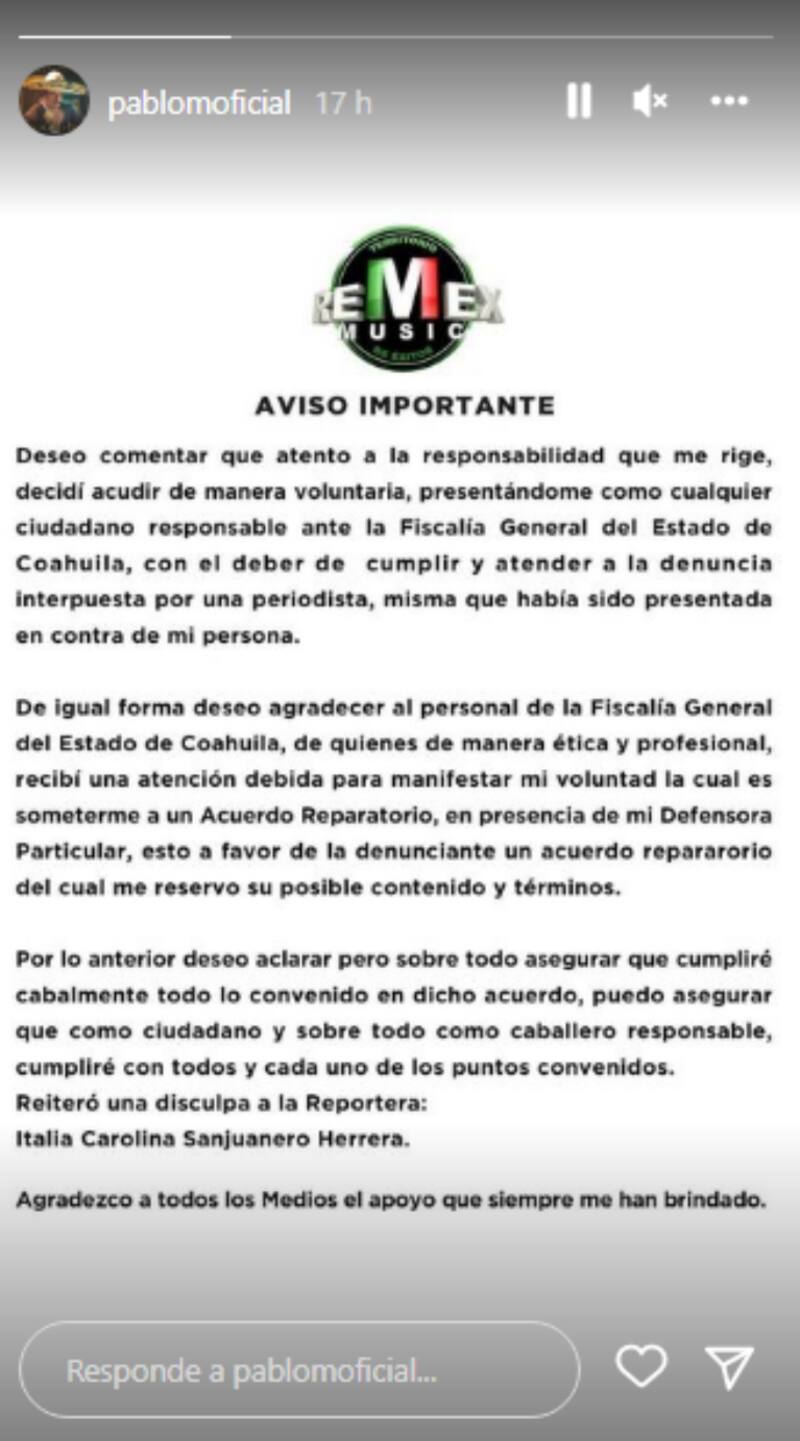 “Mi voluntad la cual es someterme a un Acuerdo Reparatorio en presencia de mi Defensora Particular, esto a favor de la denunciante un acuerdo reparatorio del cual me reservo su posible contenido y términos. Por lo anterior, deseo aclarar, pero sobre todo asegurar, que cumpliré cabalmente todo lo convenido en dicho acuerdo. Reitero una disculpa a la reportera Italia Carolina Sanjuanero Herrera. Agradezco a todos los medios el apoyo que siempre me han brindado”, concluyó dicho comunicado.