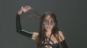 En una primera instantánea se le puede ver con un sensual atuendo compuesto por un bikini negro y una ligera y transparente prenda que la cubre de pies a cabeza, un look parecido al de Danna Paola en la promoción de sus sencillo XT4S1S.