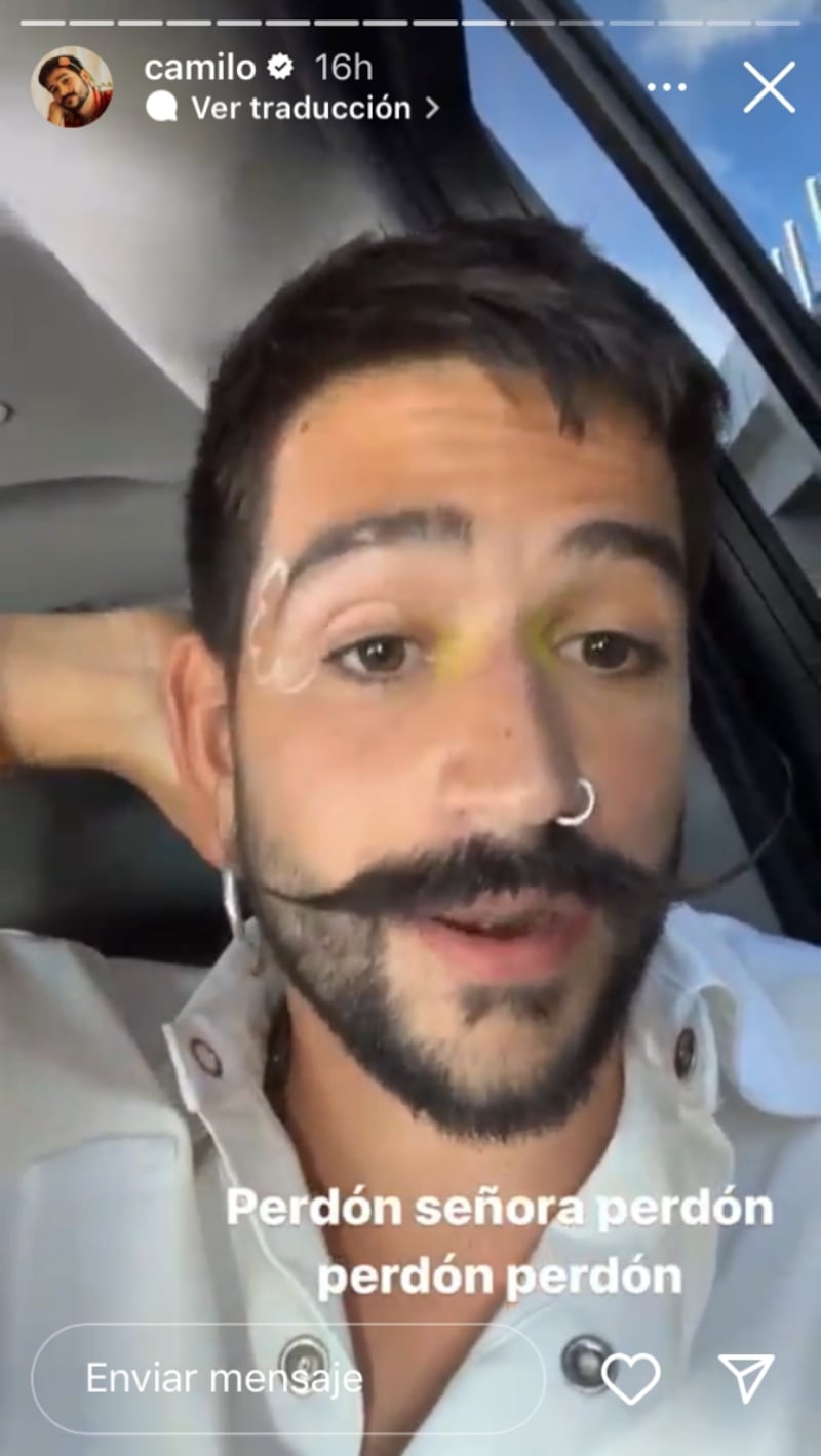 Camilo (28) compartió en sus historias de Instagram una serie de videos en los que le relató a sus fans cómo pasó de hacer algo que le pareció gracioso a ofrecer disculpas a una mujer. “Perdón señora, perdón”, escribió el cantante en sus redes sociales.