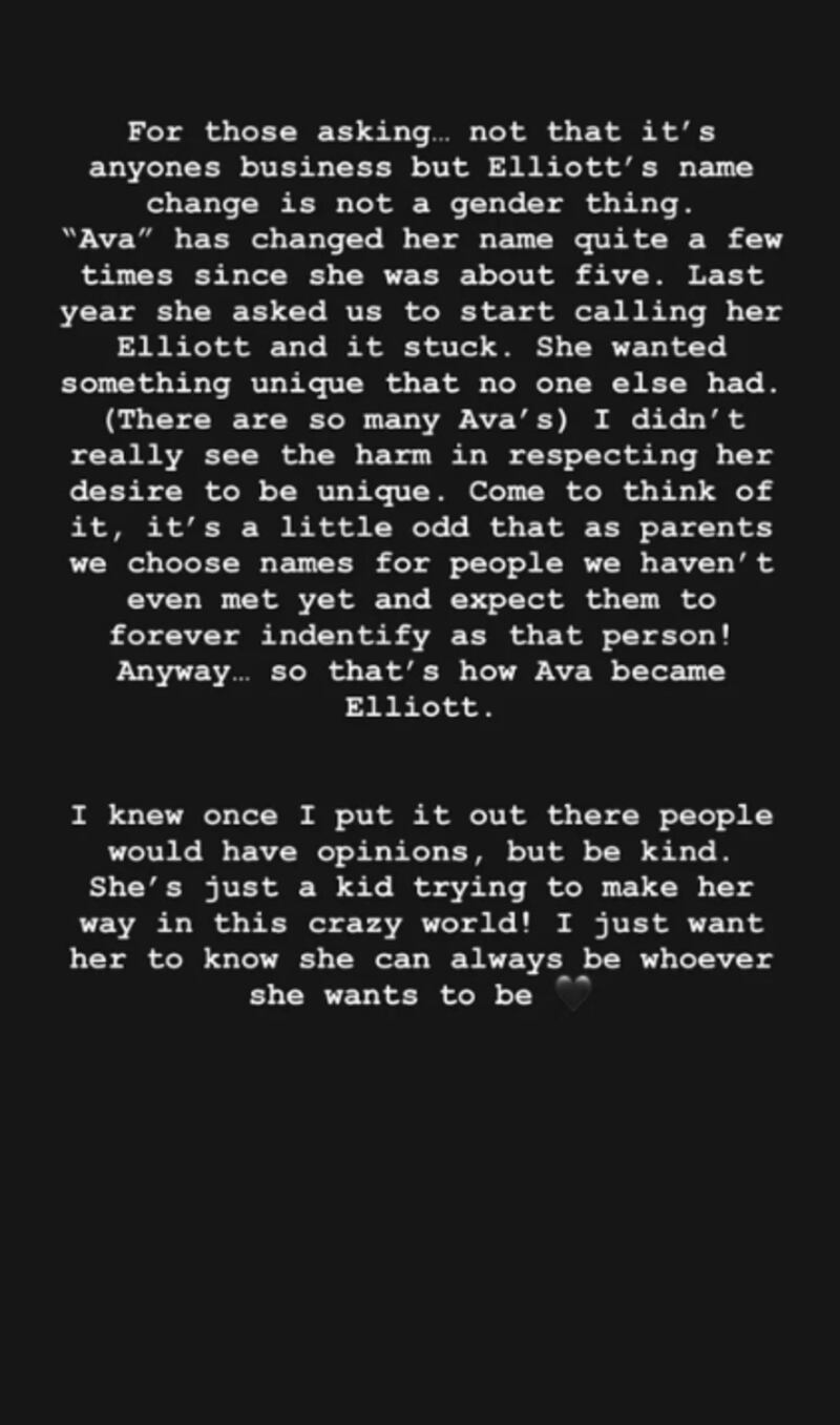 "Para quienes preguntan... No es que sea asunto de nadie, pero el cambio de nombre de Elliott no es una cosa de género. 'Ava' ha cambiado su nombre varias veces desde que tiene como 5 años. El año pasado nos pidió que comenzáramos a llamarla Elliott y se quedó", dijo la esposa del famoso integrante de los Backstreet Boys.