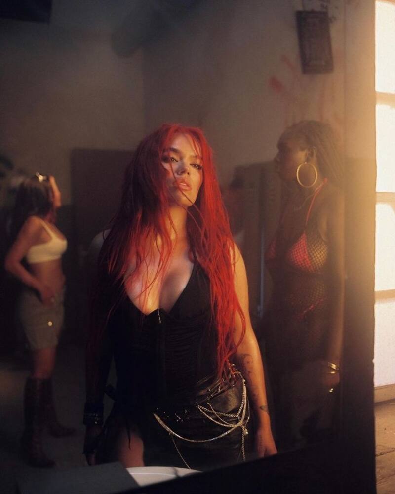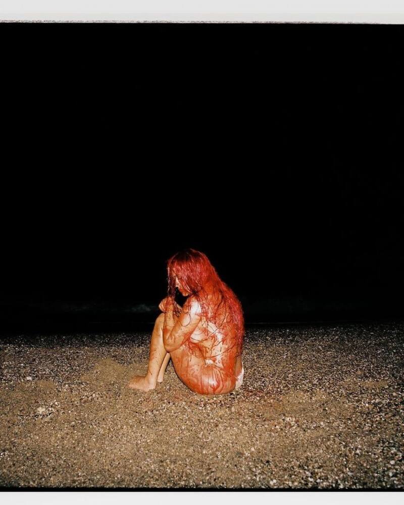 La intérprete de Provenza compartió algunas instantáneas del video, en el cual se le ve con otras personas, pero hay dos más que sorprenden, una en medio de la noche sentada en la playa desnuda y otra más en la cual puede verse su pecho al descubierto con el rostro lleno de sangre, que hace alusión a la temática de su nuevo clip.