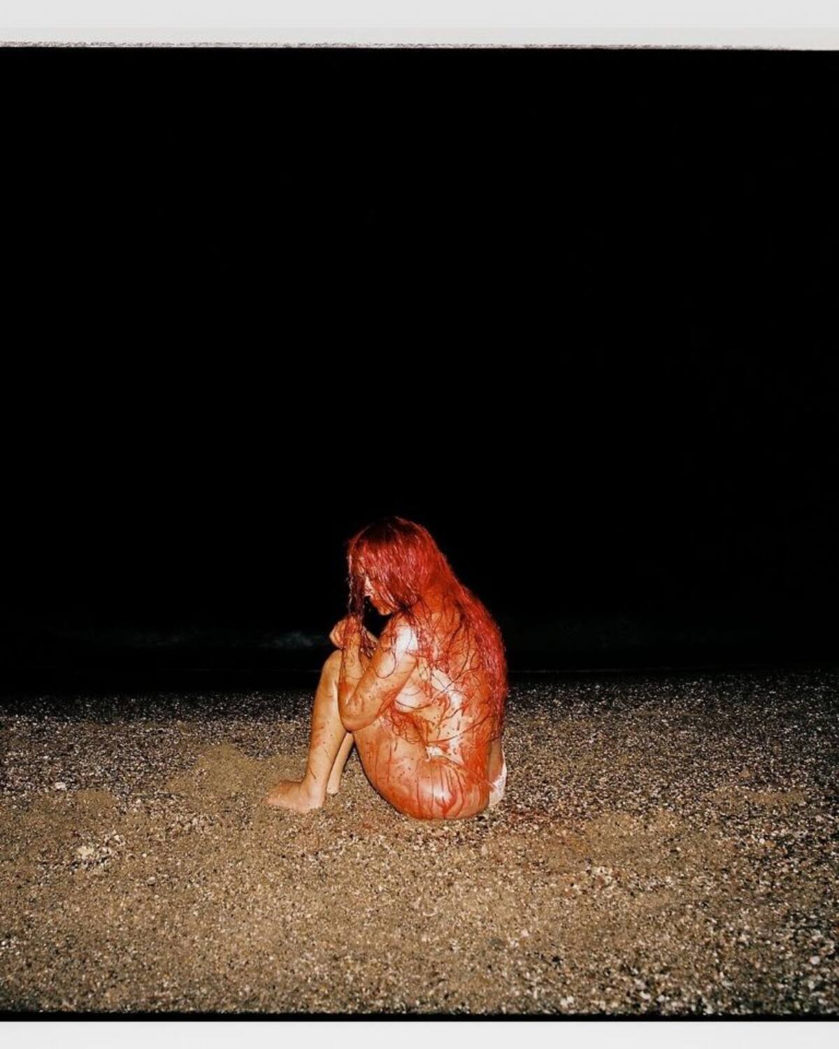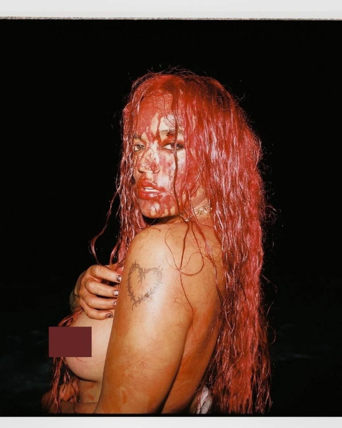 La intérprete de Provenza compartió algunas instantáneas del video, en el cual se le ve con otras personas, pero hay dos más que sorprenden, una en medio de la noche sentada en la playa desnuda y otra más en la cual puede verse su pecho al descubierto con el rostro lleno de sangre, que hace alusión a la temática de su nuevo clip.