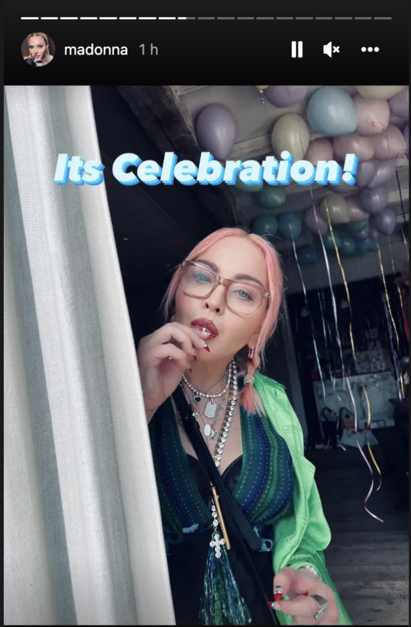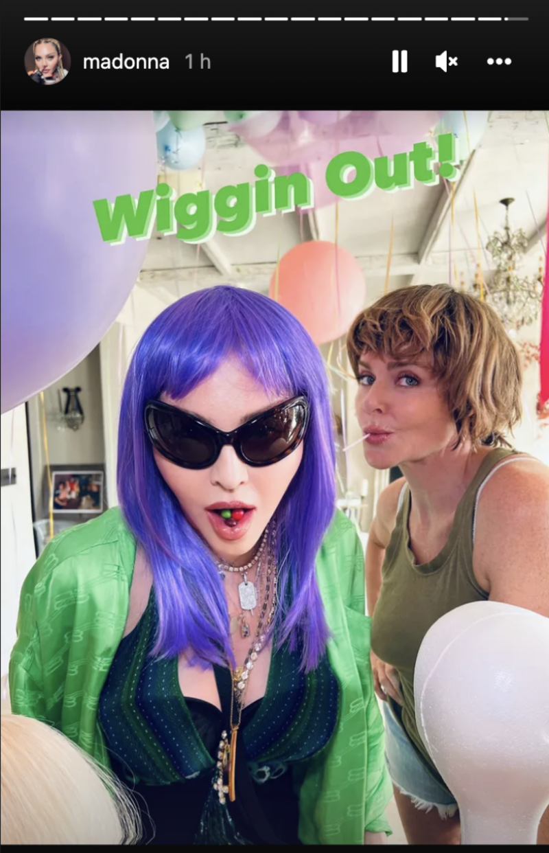 La “Reina del pop” compartió algunas fotos mediante sus historias de Instagram en las que dio cuenta de la fiesta de cumpleaños de sus gemelas Stella y Estere quienes llegaron a 10 años. En la celebración, a la que estuvo invitada la diseñadora Stella McCartney hija del músico Paul McCartney, hubo deslizadores de jabón y mago, además los invitados usaron algunas pelucas para divertirse. La cantante eligió una con un flequillo de color morado con la que posó para la cámara.