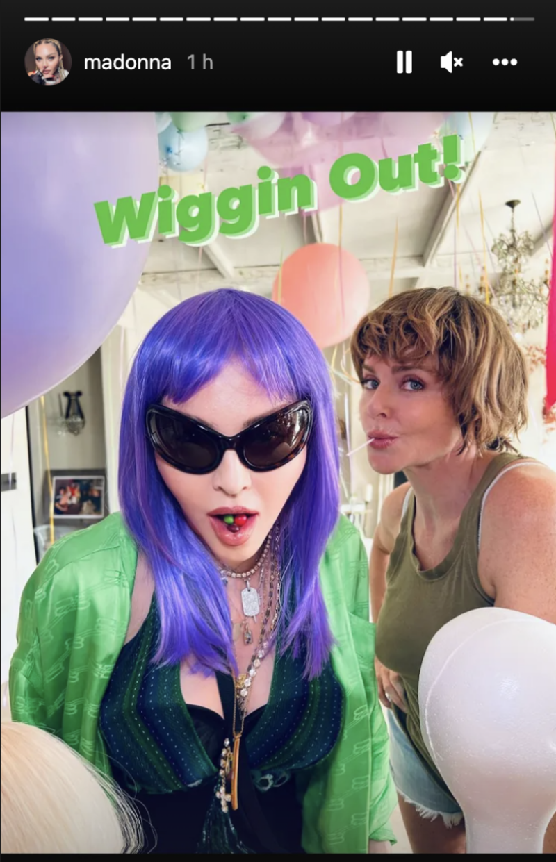 La “Reina del pop” compartió algunas fotos mediante sus historias de Instagram en las que dio cuenta de la fiesta de cumpleaños de sus gemelas Stella y Estere quienes llegaron a 10 años. En la celebración, a la que estuvo invitada la diseñadora Stella McCartney hija del músico Paul McCartney, hubo deslizadores de jabón y mago, además los invitados usaron algunas pelucas para divertirse. La cantante eligió una con un flequillo de color morado con la que posó para la cámara.