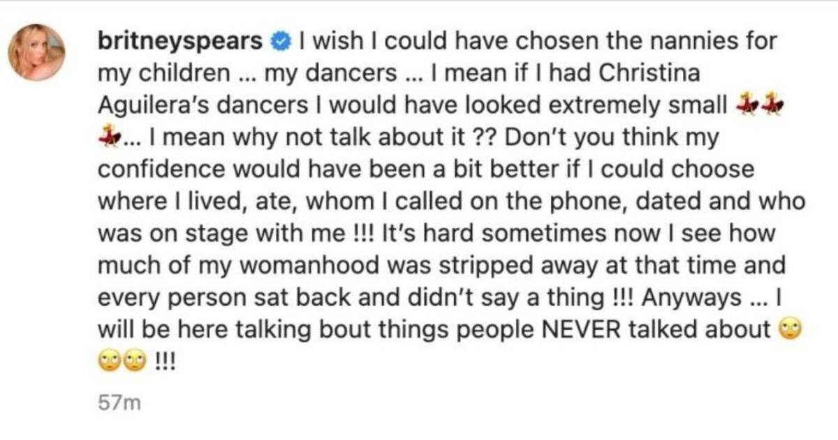Esta publicación, que ya no está disponible, también causó polémica por la fotografía que compartió, pues la empresaria aparecía desnuda, de espaldas y editó el retrato con un emoji de corazón que colocó en sus glúteos; en la publicación, enfatizó en que no volvería a los escenarios porque “quedó afectada de por vida” después de todo lo que vivió con su padre, Jamie Spears.