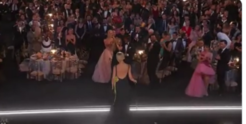 Debido a que su asistencia a este evento no se había anunciado previamente, los asistentes se mostraron sorprendidos y a la vez emocionados de verla radiante con su vestido negro de estampado dorado y no pudieron evitar ponerse de pie para recibirla con una gran ovación