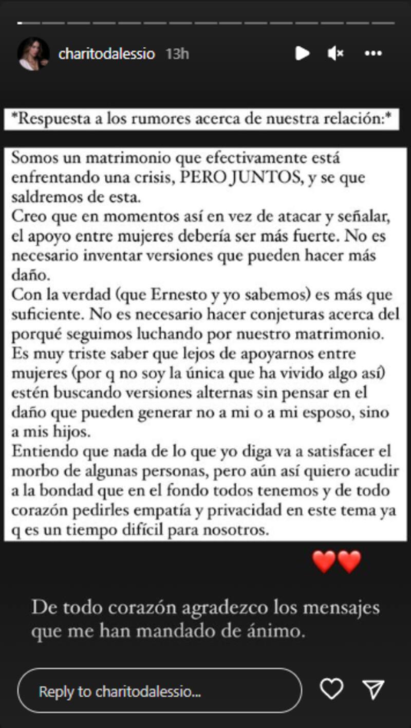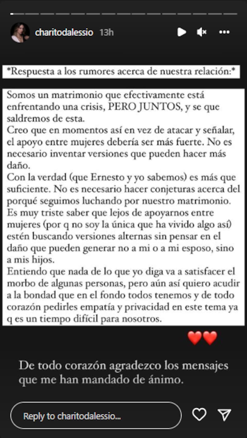 "Respuesta a los rumores acerca de nuestra relación. Somos un matrimonio que, efectivamente, está enfrentado una crisis, PERO JUNTOS, y sé que saldremos de esta", comenzó a decir en el texto compartido en sus historias.