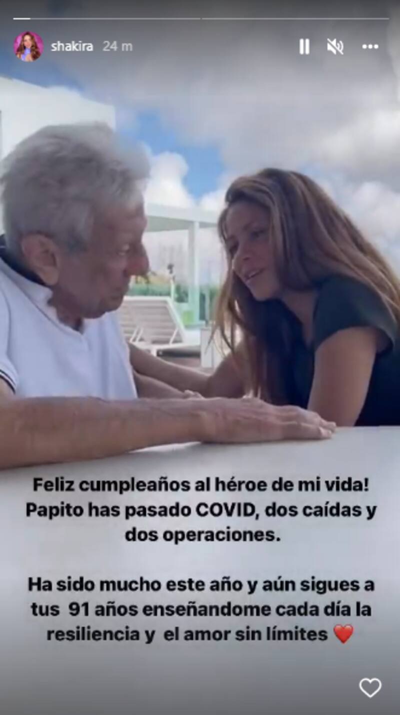 "Ha sido mucho este año y aún sigues a tus 91 enseñándome cada día la resiliencia y el amor sin límites", añadió Shakira en el conmovedor mensaje para don William, donde además agregó un corazón como muestra de cariño hacía él.