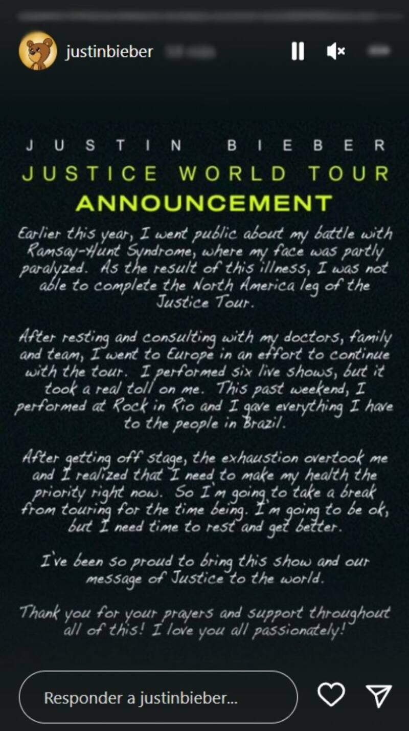 En su concierto en Rio de Janeiro, Brasil, los problemas se hicieron insostenibles para el cantante de Sorry: "Después de bajar del escenario, el agotamiento me superó y me doy cuenta de que necesito hacer de mi salud la prioridad en este momento", expresó para entregar la amarga noticia a los fans.
