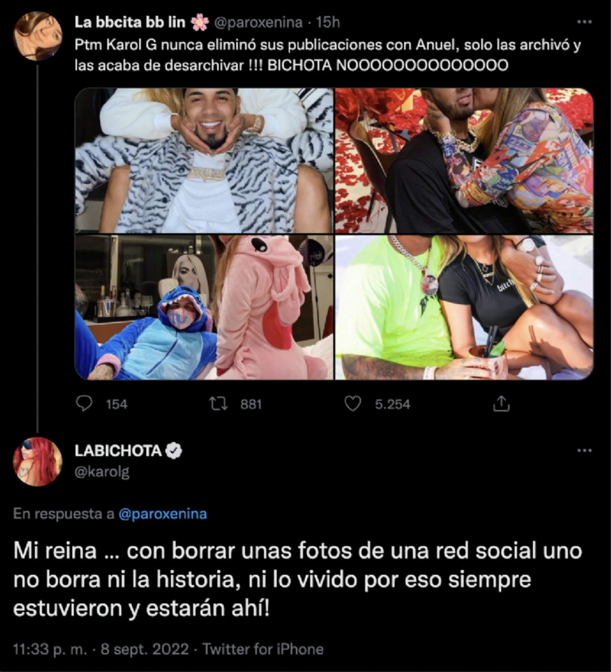 “Ptm Karol G nunca eliminó sus publicaciones con Anuel, solo las archivó y las acaba de desarchivar !!! BICHOTA NO”, escribió la usuaria @paroxenina en Twitter.