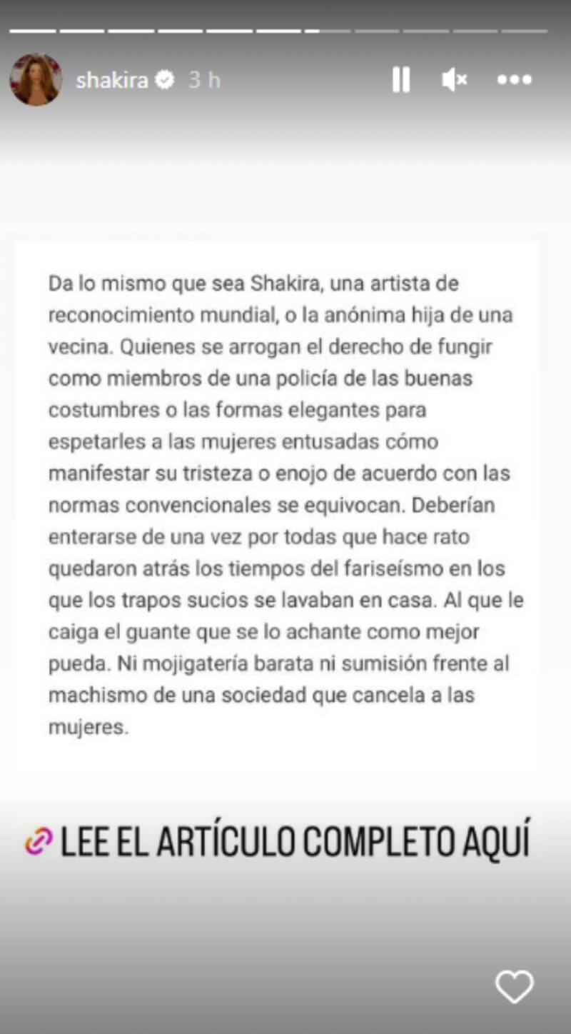 “Da lo mismo que sea Shakira, una artista de reconocimiento mundial, o la anónima hija de una vecina. Quienes se arrogan el derecho de fungir como miembros de una policía de las buenas costumbres o las formas elegantes para espetarles a las mujeres entusadas cómo manifestar su tristeza o enojo de acuerdo con las normas convencionales, se equivocan. Deberían enterarse de una vez por todas que hace rato quedaron atrás los tiempos del fariseísmo en los que los trapos sucios se lavaban en casa”, reza una parte del artículo escrito por Erika Fontalvo.