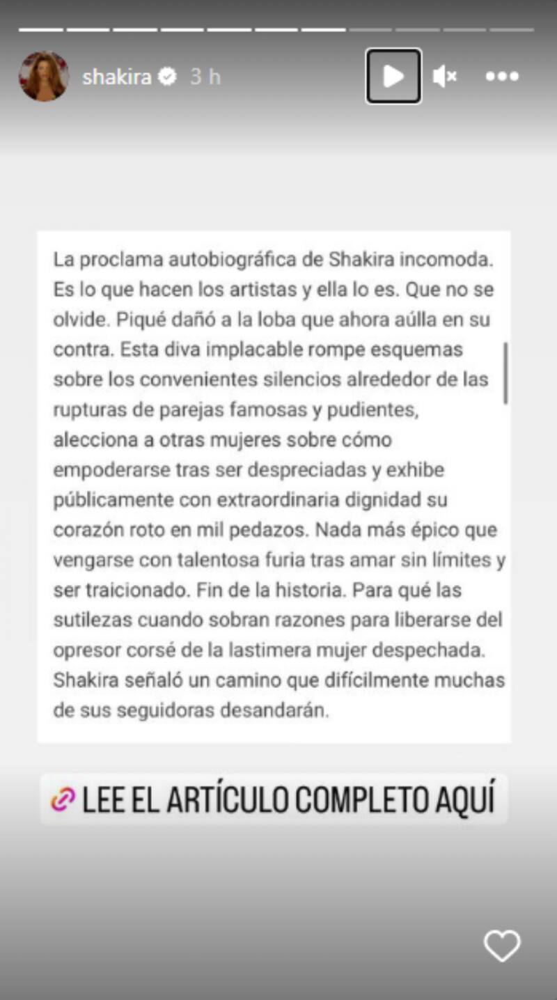 A través de su cuenta oficial de Instagram, Shakira compartió primero un extenso texto de un artículo sobre su nueva pieza musical, publicado por el diario El Heraldo, en el que se intenta justificar los motivos para contar su parte de la historia en una canción. Además, el escrito señaló que la letra del tema podría tratarse de una posible venganza en contra del deportista debido a sus infidelidades.
