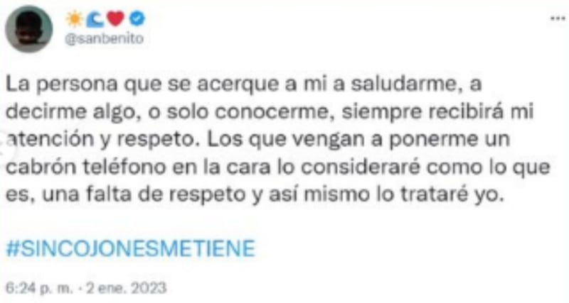 “La persona que se acerque a mi a saludarme, a decirme algo, o solo conocerme, siempre recibirá mi atención y respeto. Los que vengan a ponerme un cab**n teléfono en la cara lo consideraré como lo que es, una falta de respeto y así mismo lo trataré yo”, escribió el cantante. Ahora, el puertorriqueño se habría arrepentido de lo que publicó, ya que el escrito no aparece en su cuenta oficial.