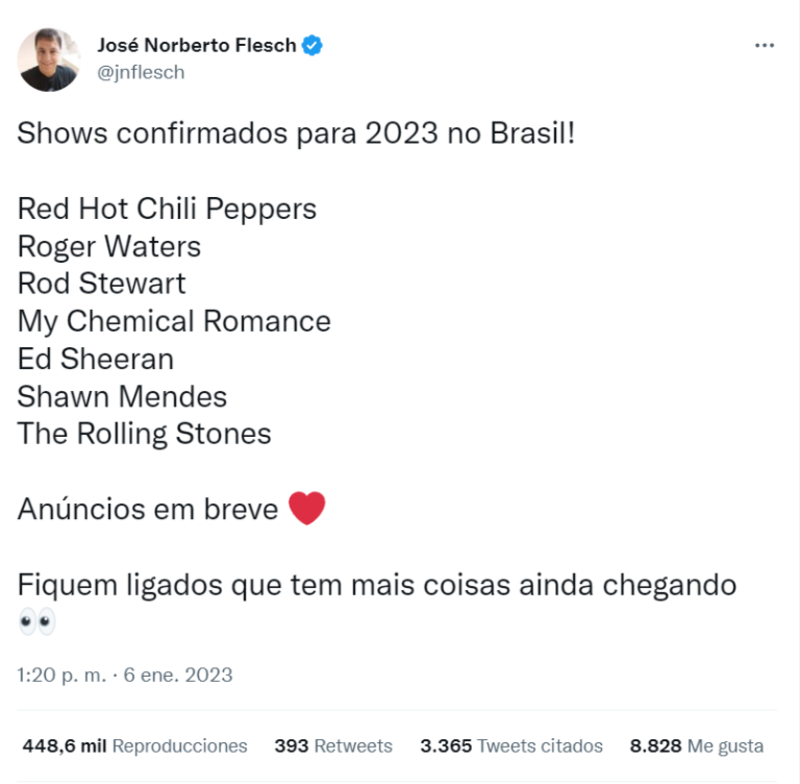 Recientemente el periodista brasilero, José Norberto Flesch, famoso por anunciar conciertos en la región, confirmó en su cuenta personal de Twitter un listado de artistas que programaron presentaciones en Brasil, abriendo la posibilidad de visitar otros puntos del continente.