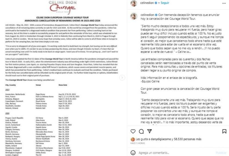 “Con tremenda decepción tenemos que anunciar hoy la cancelación del Courage World Tour”, escribió la cantante en un comunicado en su cuenta oficial de Instagram. Seguidamente, Céline aseguró que le llena de mucha tristeza tener que alejarse de los escenarios, pero está haciendo todo lo posible para continuar encantando a sus fanáticos.