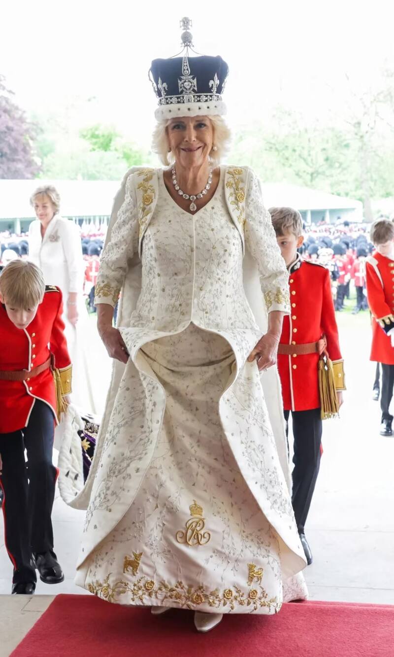 Como un tributo especial a sus hijos y nietos, la Reina Camilla hizo bordar sus nombres en la parte inferior de su vestido de Coronación.