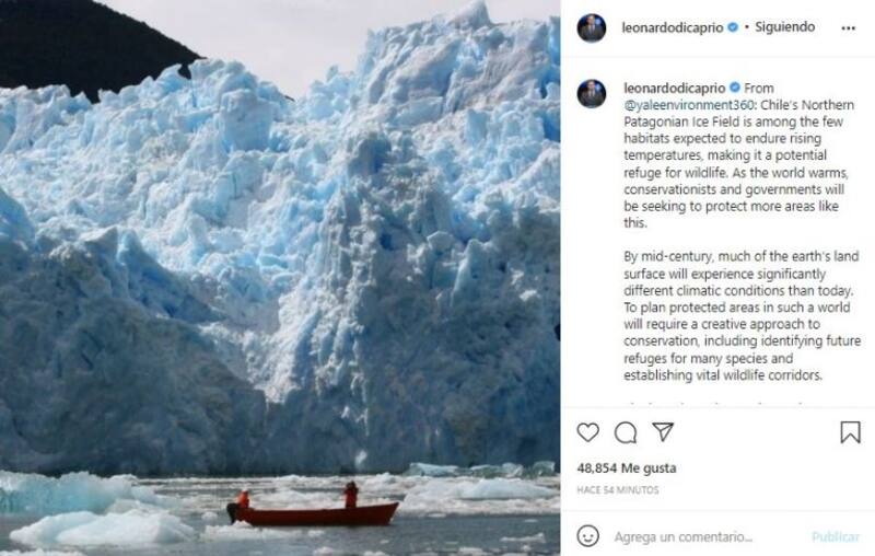 Di Caprio, que ha dedicado gran parte de sus últimos años a difundir los problemas medioambientales, escribió en su cuenta lo siguiente: "El Campo de Hielo Patagónico Norte de Chile se encuentra entre los pocos hábitats que se espera que soporten el aumento de temperaturas, lo que lo convierte en un refugio potencial para la vida silvestre. A medida que el mundo se calienta, los conservacionistas y buscarán proteger más áreas como ésta".