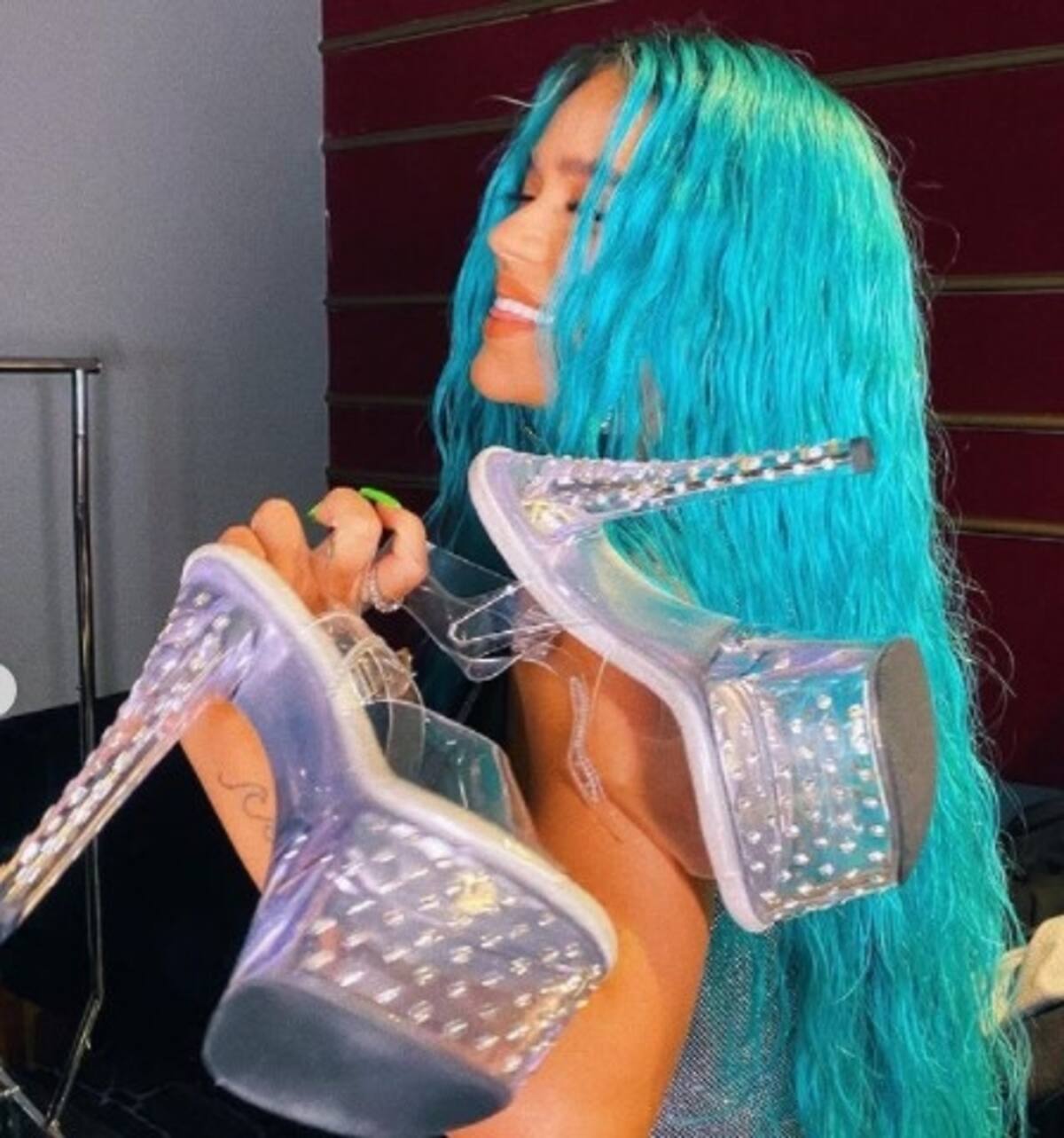 La pérdida del equilibrio de Karol G fue evidente y pudo deberse a que cuando empezó a bajar las escalinatas, el taco de su calzado del pie derecho se queda enganchado con el primer escalón, quedando sin ninguna estabilidad.