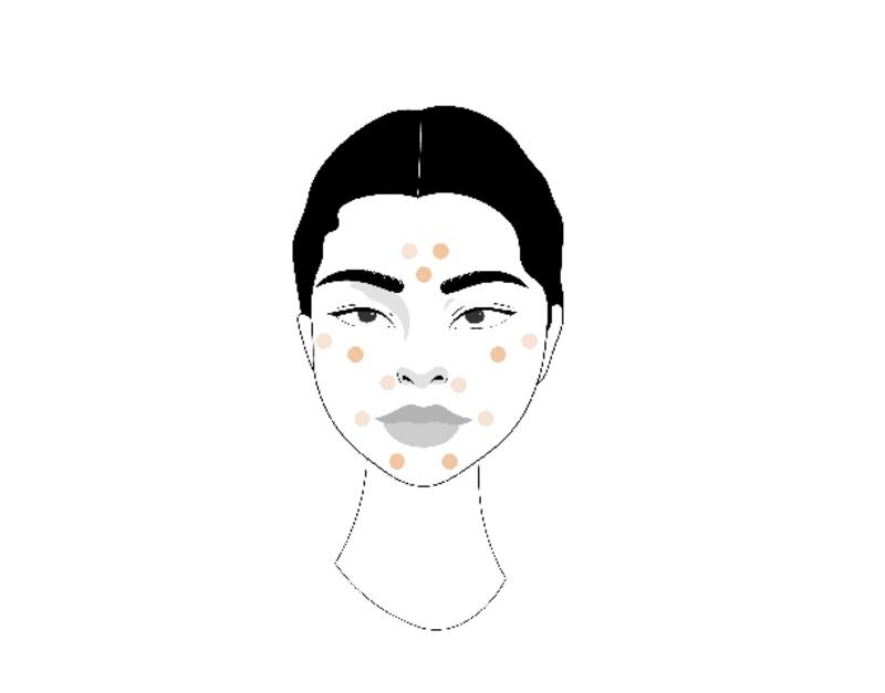 Esparcir la base líquida con una brocha, realizando movimientos circulares para que difuminar bien el producto. La clave está en colocar los puntos como se observa en la imagen, de esta manera cuando se mezclen los tonos, la piel lucirá una capa uniforme y natural.