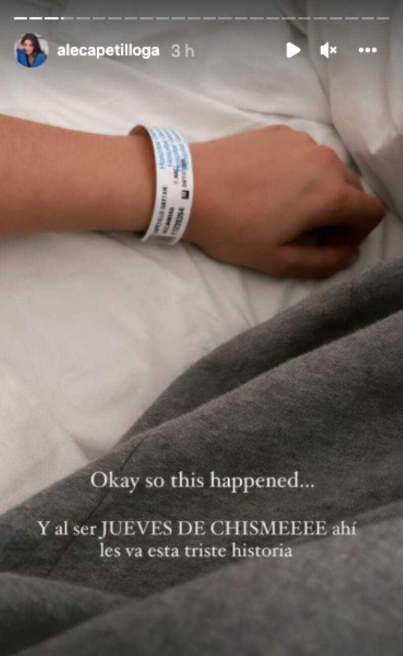 El pasado miércoles, la joven influencer subió una historia desde la cama de un hospital y sin decir por qué estaba internada causó mucha preocupación entre sus seguidores: “Y al ser jueves de chismes, ahí les va una triste historia”, indicó Capetillo.