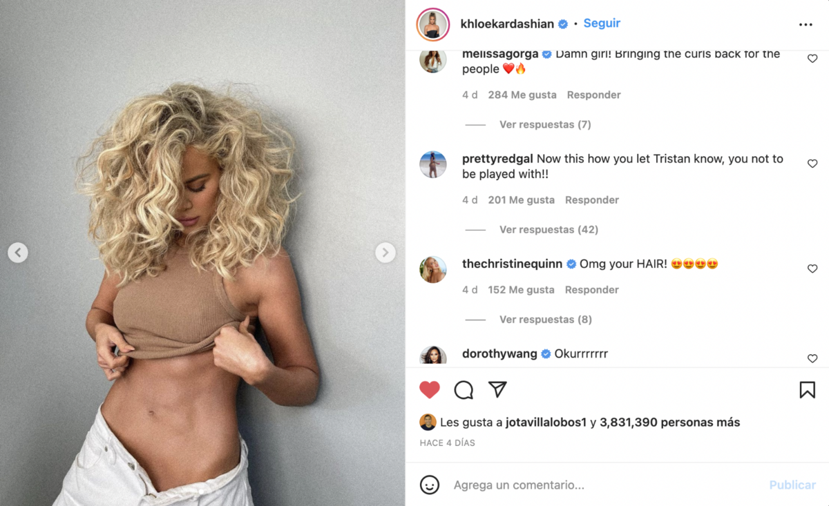 Khloé aparece con la cabellera más rubia y rizada mientras viste una blusa de punto color camel que deja ver su torneada figura y no sólo eso, reveló sus bien trabajados abdominales con un pantalón de mezclilla blanco que prefirió no abrochar. La serie de fotografías las acompañó sin ninguna descripción mas que el simple emoji de una corona.